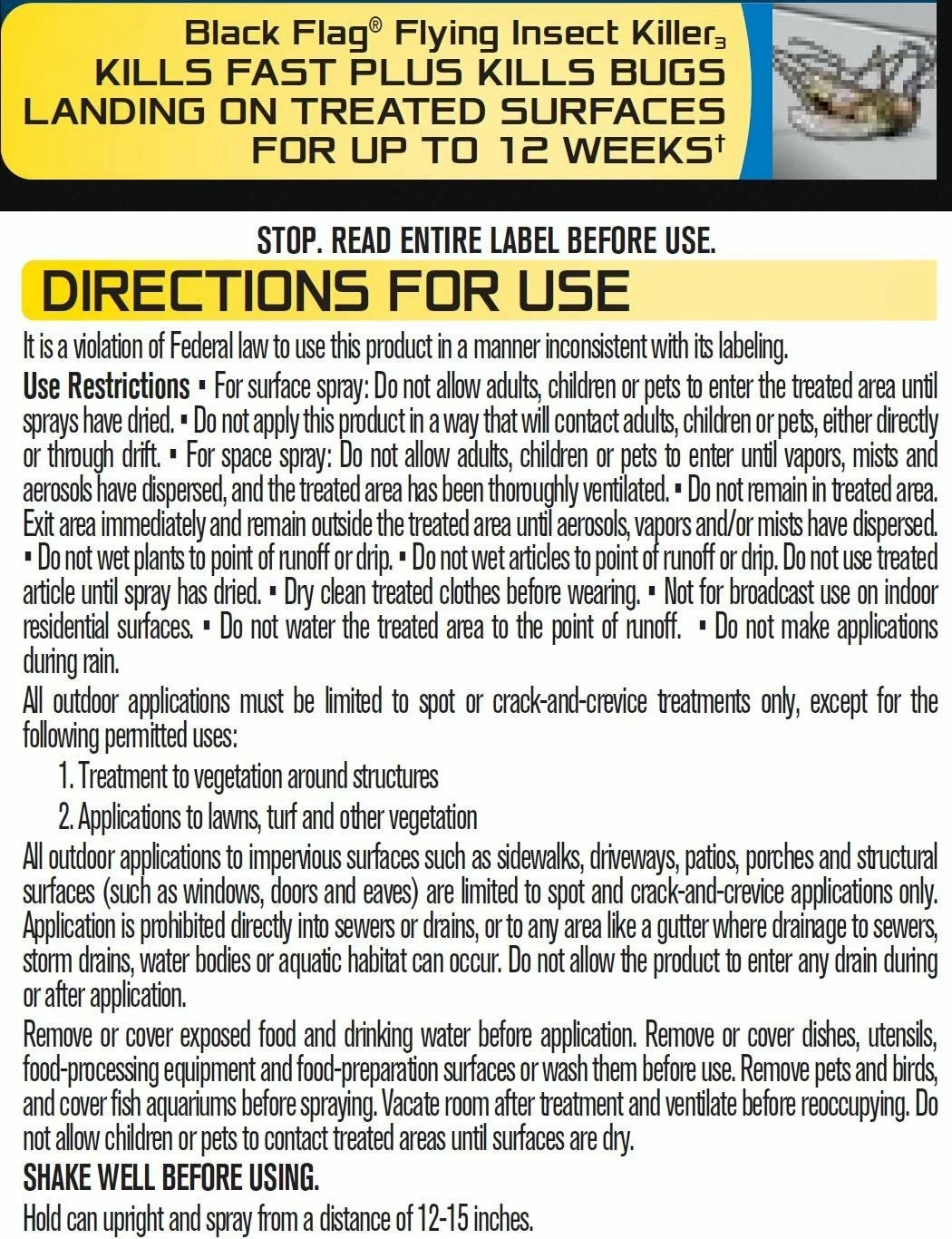 Insects Invading Your Corner Of The World? Whatever Insect You’re Fighting, Black Flag Products Are Dedicated To Providing The Tools You Need To Regain Control. With Formulas That Act Fast And Never Back Down, Black Flag Insect Controls Have Been Arming Homeowners In The Battle Against Invading Bugs For More Years Than Any Other Brand.black Flag Flying Insect Killer Kills Fast – Plus, It Kills Bugs Landing On Treated Surfaces Up To 12 Weeks (Excluding Mosquitoes, Wasps, Hornets And Yellowjackets).