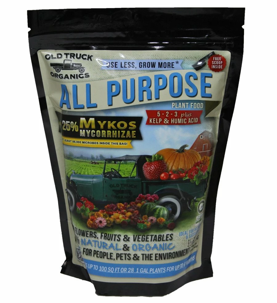 A Natural And Organic Plant Food For Use On Fruits, Flowers, Vegetables, Herbs, Succulents And Even Native Plants. A High Quality, Organic Fertilizer With An All Natural Root Enhancing Soil Microbe Known As Mycorrhizae (Mykosâ„¢) That Helps Transplants Establish More Quickly, Flowers Appear Sooner And Fruits And Veggies Ripen Even Earlier! Some Fertilizer Brands Add Mycorrhizae In Only Trace Amounts Containing Less Than 100 Active Propagules In A 4 Lb Container. Each 2.2 Lb Bag Of Old Truck Organic All Purpose Has At Least 85,000 Propagules Ready To “Spring Into Action” As Soon As They Come In Contact With The Roots Of Your Plants.