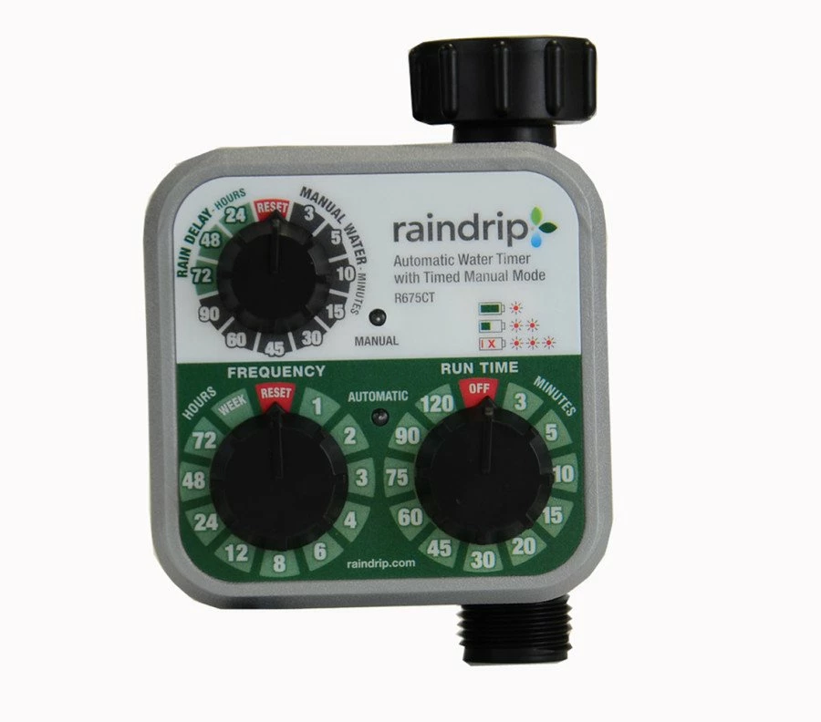 The Raindrip Automatic Water Timer is a single station 3 dial watering faucet timer. It features timed manual watering and timed rain delay for up to 72 hours with no program loss. Solenoid & diaphragm valve on/off control, low battery indicator, fail safe to off when battery level becomes low are additional favorite features. Includes a universal fitting for drip tubing, is easy to program and attaches to any outdoor faucet, standard drip tubing or garden hose. AA alkaline batteries (2) are not included. Program is retained when batteries are replaced (if changed within 15 seconds). Must have a minimum of 15 PSI for unit to work properly.