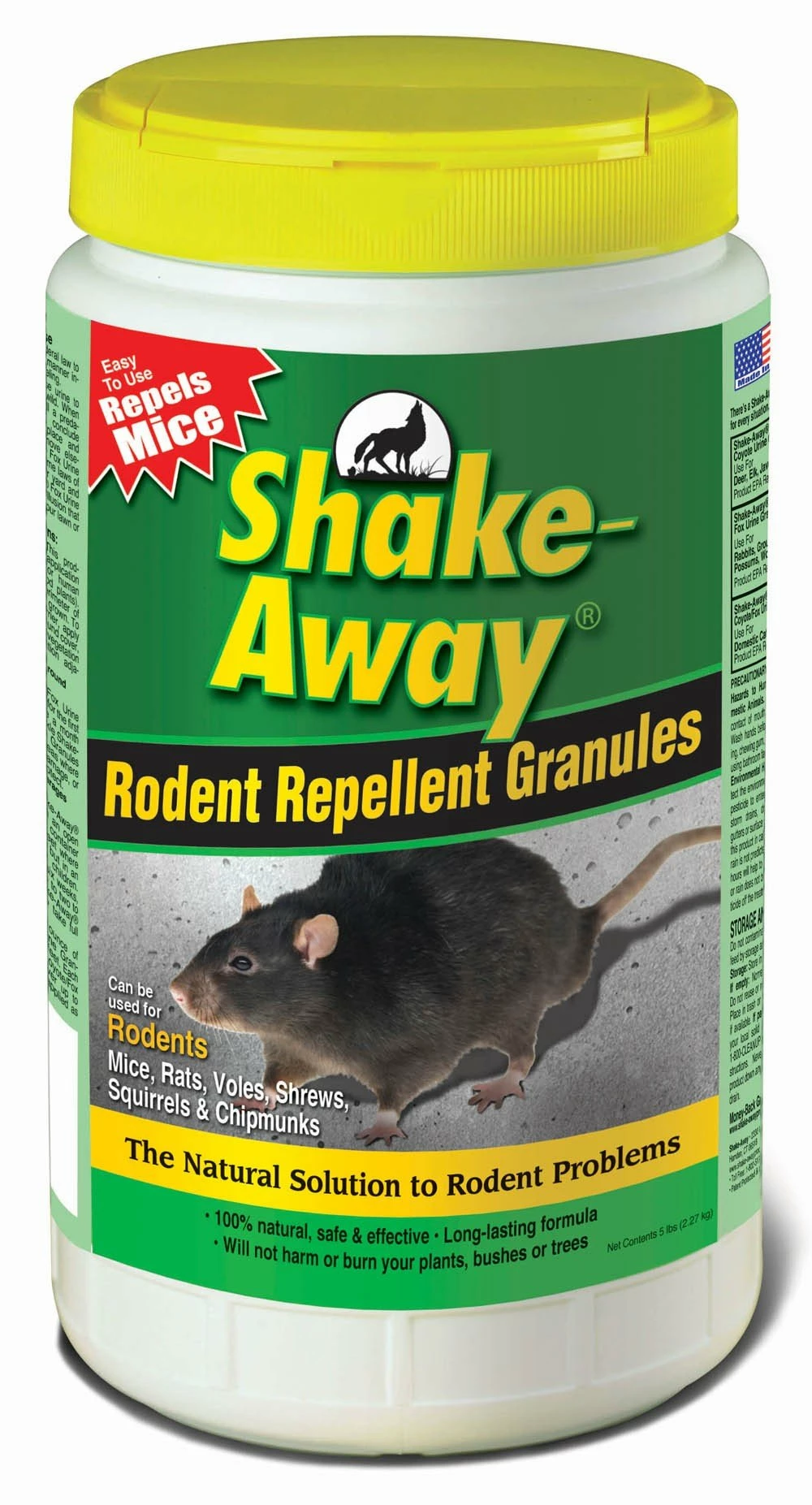 All natural formula and 100% organic, it is perfect for mice, rats, voles, shrews, squirrels, and chipmunks. Use to protect gardens, foundations, attics, basements, garages, or sheds. Safest, simplest, most effective, and 100% organic method to keep pesky animals away. Garden-safe and pet-friendly. Simply apply twice a week for the first two weeks, and then twice a month for maintenance. The most effective and easy-to-use rodent repellent in the industry today. This non-toxic formula dismisses the concern of having dead animals scattered inside walls or in attics, as mice will simply avoid the treated area. Simply apply twice a week for the first two weeks, and then twice a month for maintenance. 100-Percent organic. Shake Away 100-percent organic animal repellent products safely and effectively repel animals. Shake Away’s patented formula uses predator scent, in the form of non-toxic urine granules, to create the illusion that predator animals are present. When an animal detects the scent of its predator, its natural survival instinct compels it to leave and avoid that area. Put the power of the predator to work in your lawn & garden. Great for mice, rats, shrews, voles, chipmunks and squirrels.